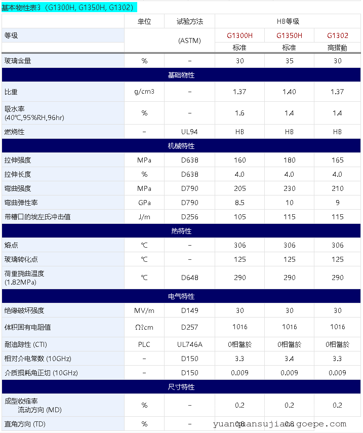 G1300H、G1350H作为标准的HB等级,是一种可广泛适用于电气电子部件的材料。G1302实现了高滑动性。HB等级采用了卤素类阻燃剂。